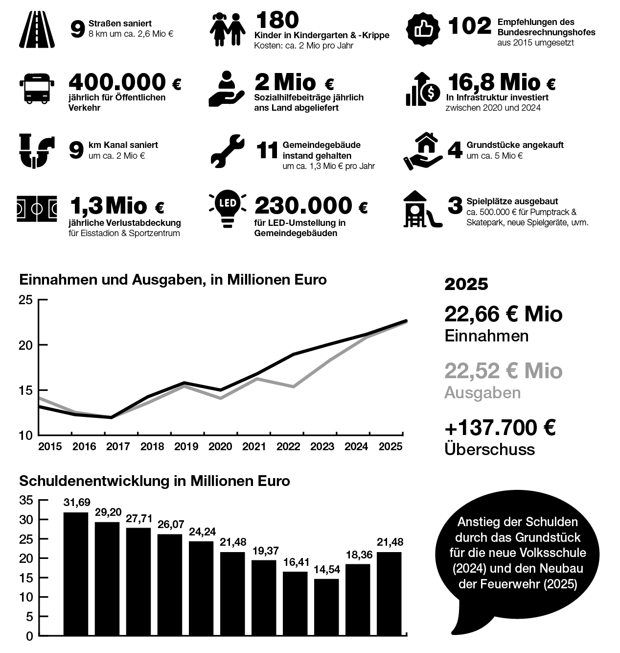 - Die Feuerwehr hat ein neues Löschfahrzeug und neue Ausrüstung erhalten, Bürgerliste-Gemeinderat und Architekt Alfred Wolf hat gemeinsam mit der Feuerwehr kostenlos das neue Feuerwehrhaus geplant, dass 2026 fertiggestellt wird.