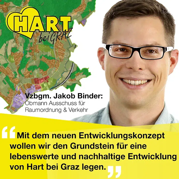 „Mit dem neuen Entwicklungskonzept für unsere schöne Gemeinde wollen wir den Grundstein für eine lebenswerte und nachhaltige Entwicklung von Hart bei Graz legen. Um die zu erarbeitenden Zielsetzungen und Maßnahmen auf eine breite Basis zu stellen sowie transparent und nachvollziehbar zu machen, soll die Erstellung durch einen breit aufgestellten Beteiligungsprozess von der Bevölkerung begleitet werden“.