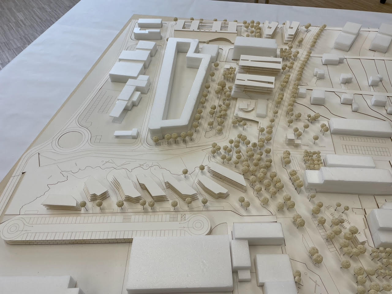 Bild: Architekt Alfred Wolf und das Siegerprojekt – So soll das neue Harter Ortszentrum aussehen: Attraktive Grünraumgestaltung gab den Ausschlag.